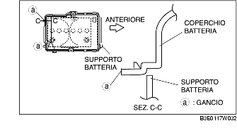 4. Sistemare il coperchio batteria sui ganci C del supporto batteria in due punti.