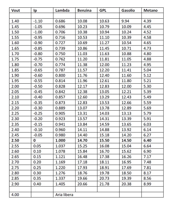 ![]() Vout- Ip LAMBDA E AFRs PER I DIVERSI TIPI DI CARBURANTE